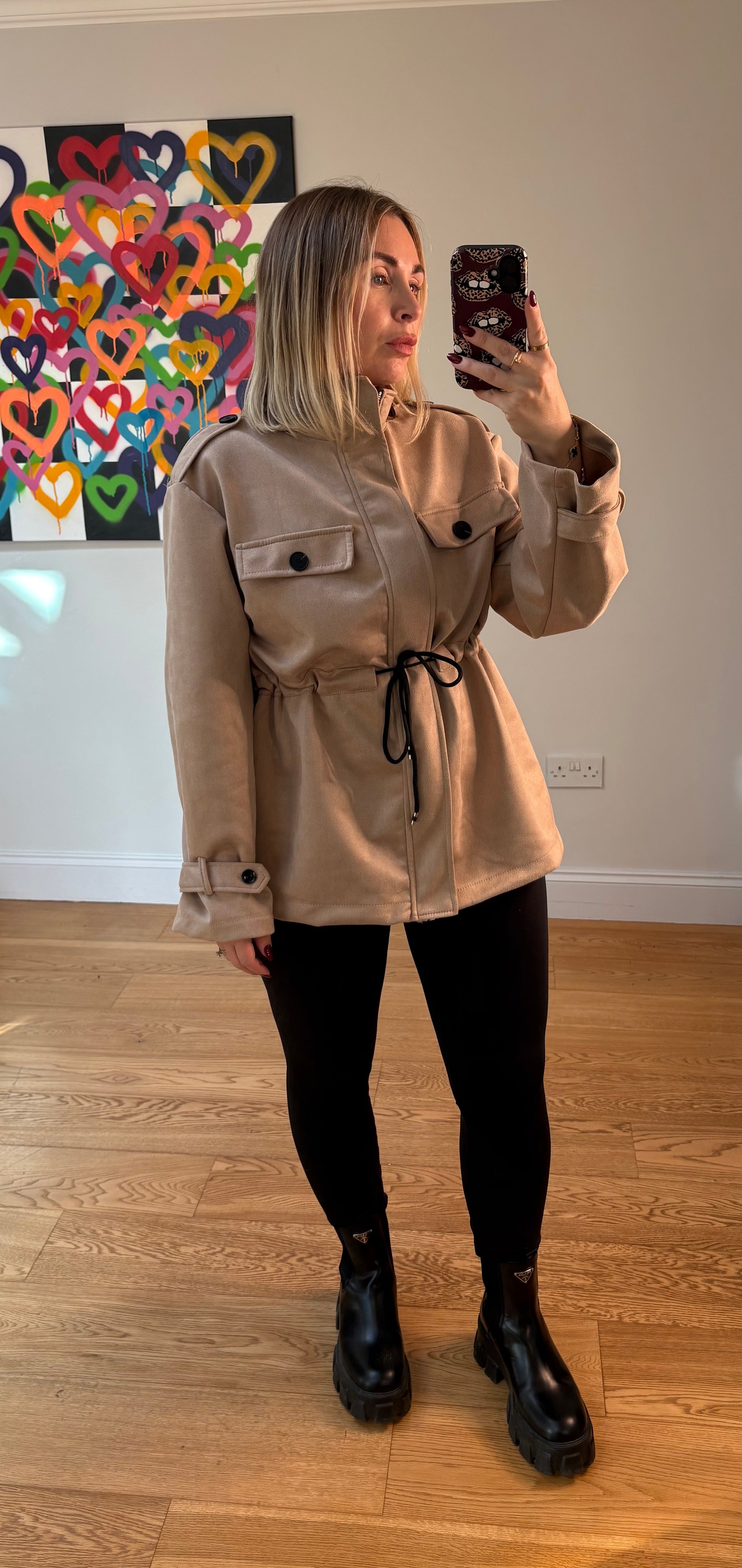 Elevate your outerwear with this oversized faux suede jacket—a lightweight, transitional piece perfect for layering between seasons. Featuring sleek black button detailing and a flattering drawstring waist, it cinches you in just right to create a beautifully balanced silhouette. The relaxed, one-size fit comfortably suits UK sizes 8–16, making it a versatile and effortless wardrobe staple.
